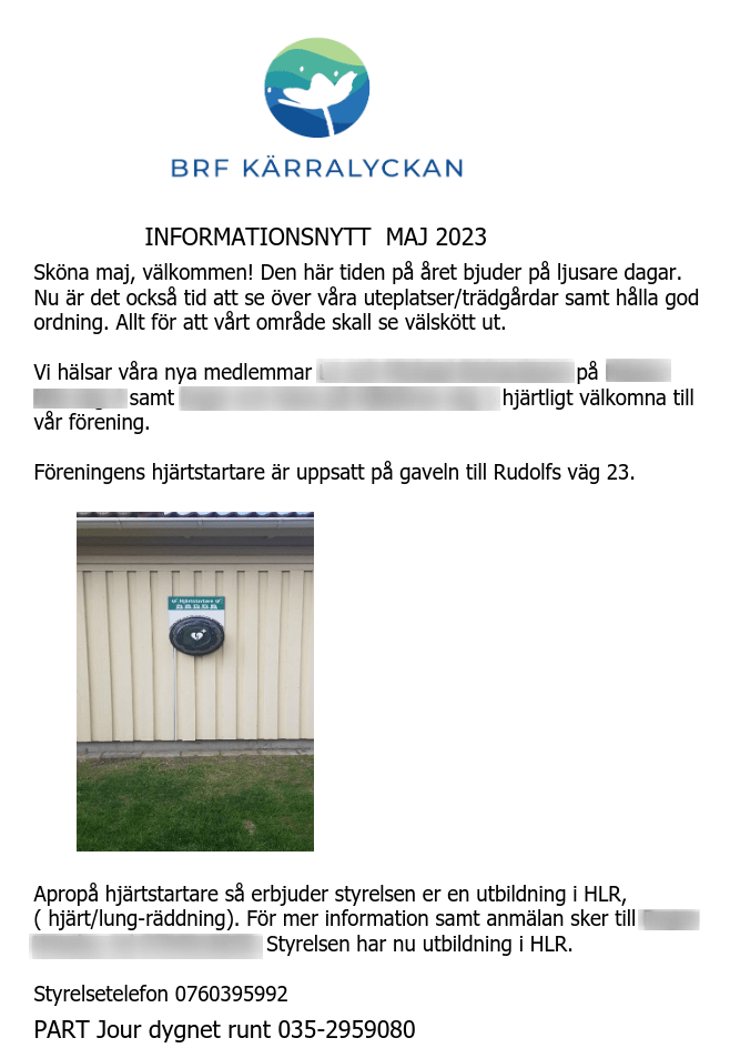 Styrelsen erbjuder även en utbildning i HLR (hjärt- och lung-räddning) samt hjärtstartare. Vi hoppas att så många som möjligt vill vara med på det. Hör av er till oss, eller direkt till ordförande vid intresse!