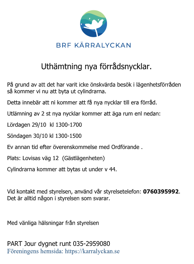 OBS! Följande information gäller endast de boende som har förråd i våra gemensamma förrådslokaler, dvs 2 och 3 rumslägenheterna. OBS!