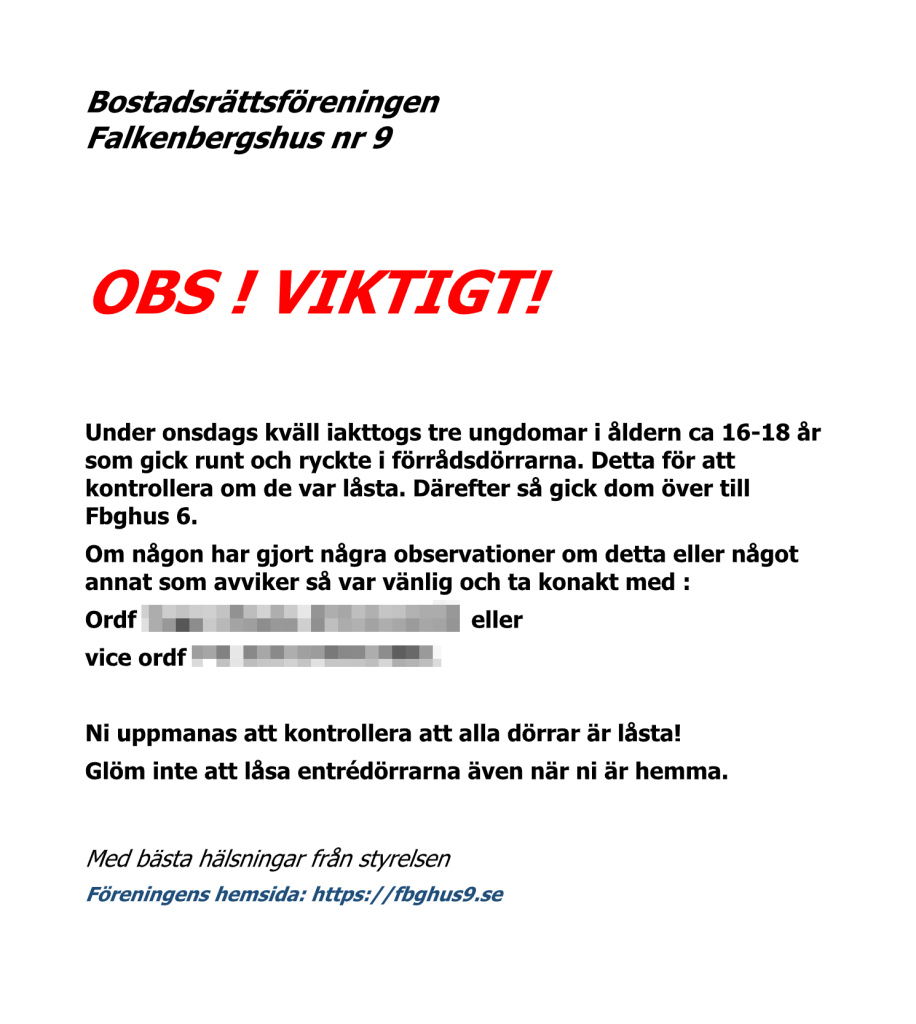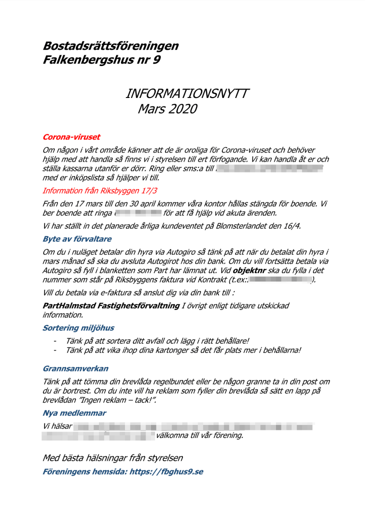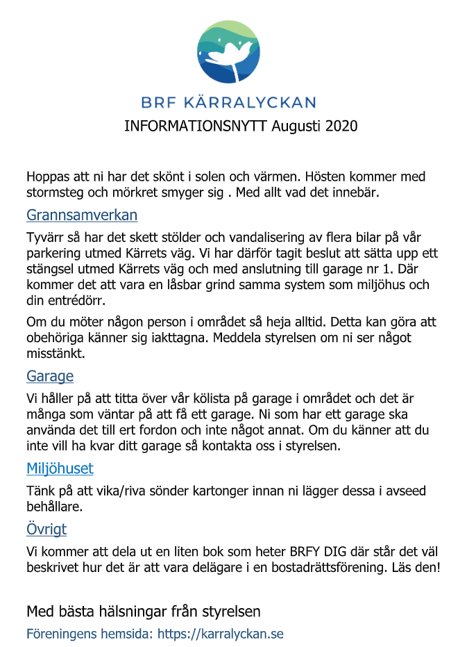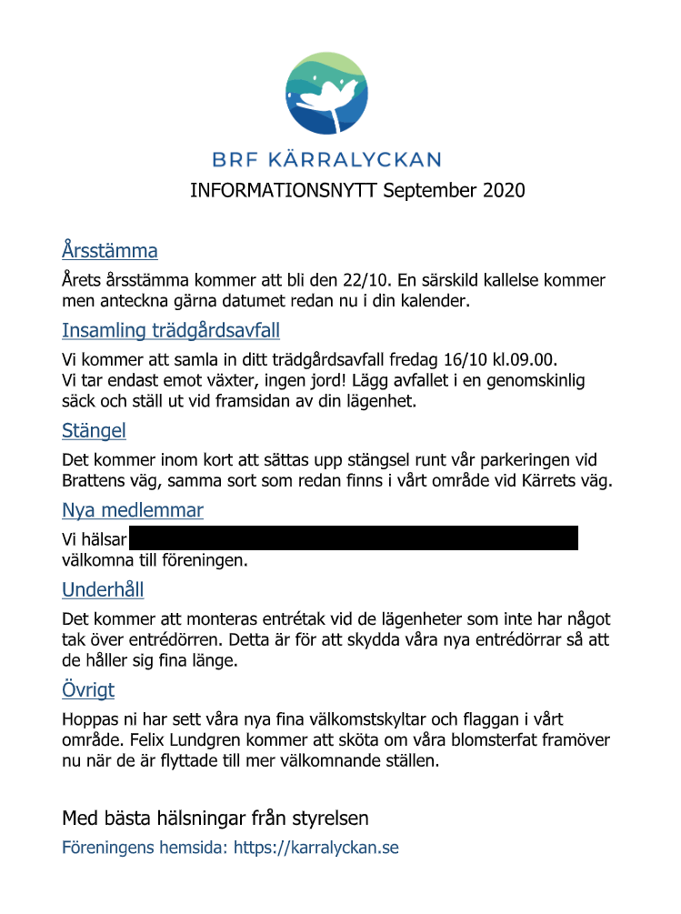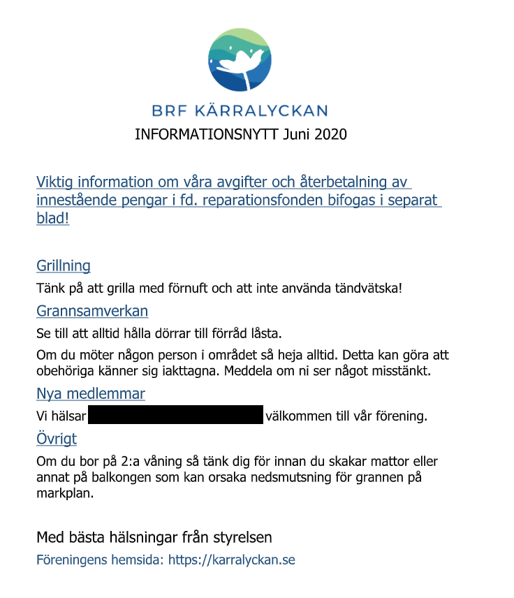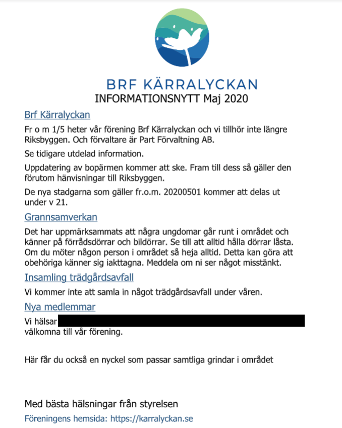 Efter stämman kommer Peter och Anna från nya förvaltaren (PART Fastighetsförvaltning AB) att presentera sig. Vi kommer bland annat få veta vad som kommer att hända inför bytet och få en chans att ställa frågor.